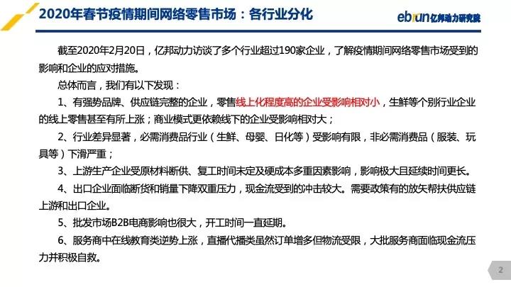 針對(duì)疫情期間網(wǎng)絡(luò)零售市場(chǎng)受到的具體影響及企業(yè)的應(yīng)對(duì)措施,億邦動(dòng)力研究院出品了一份快報(bào)。該報(bào)告既涵蓋了多個(gè)行業(yè)的詳情及企業(yè)案例,也提供了網(wǎng)絡(luò)零售市場(chǎng)疫情后續(xù)趨勢(shì)的預(yù)判。