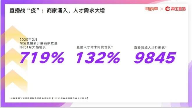 智聯(lián)招聘聯(lián)合淘榜單發(fā)布的《2020年春季直播產(chǎn)業(yè)人才報告》顯示,2020年2月淘寶直播新開播商家數(shù)量環(huán)比1月大幅增長,達到719%;直播人才需求同比增長132%,直播領(lǐng)域人均月薪達9845元。