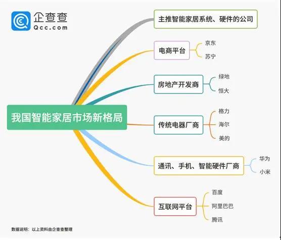 不過,目前中國智能家居市場正在形成新的格局,企查查整理了部分涉足智能家居的品牌,大致分布在這六大陣營:主推智能家居概念的智能家居系統(tǒng)和智能家居硬件初創(chuàng)公司陣營;以格力、海爾、美的等為代表的傳統(tǒng)電器廠商陣營;以華為、小米等為代表的通訊、手機(jī)、智能硬件廠商陣營;以BAT為代表的互聯(lián)網(wǎng)平臺(tái)陣營;以京東、蘇寧等為代表的電商平臺(tái);以綠地、恒大為代表的房地產(chǎn)開發(fā)商。