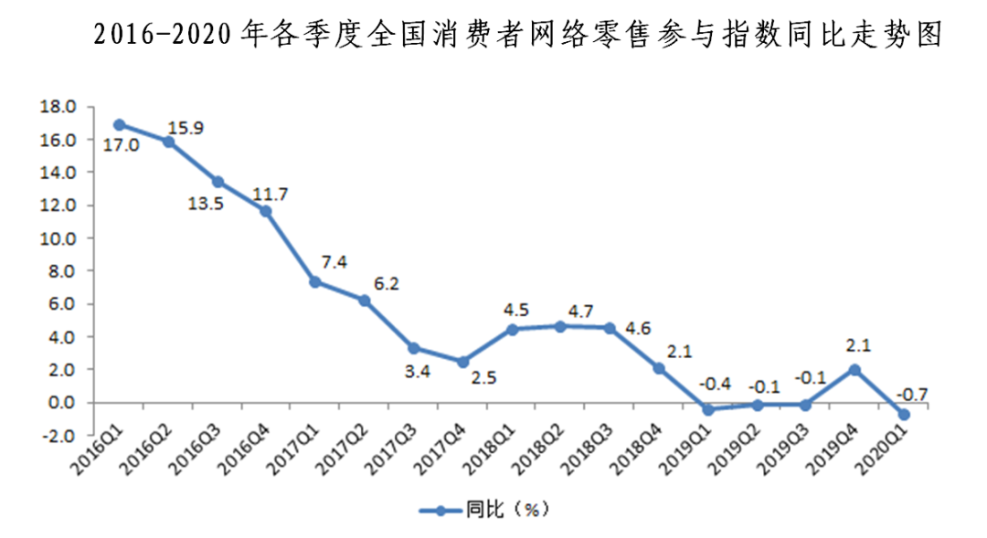 近日,中國國際電子商務中心與易觀聯(lián)合發(fā)布了2020年一季度“全國網(wǎng)絡零售發(fā)展指數(shù)”及其分指數(shù)。2020年一季度,全國網(wǎng)絡零售發(fā)展指數(shù)受疫情影響,環(huán)比下降2.7%,增速較上季度下降6.1個百分點;但同比仍增長5.1%,增速較上季度提升2.5個百分點。