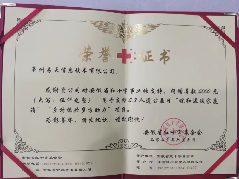 今年的5月8日是第76個(gè)世界紅十字日,中國紅十字會(huì)總會(huì)與騰訊公益聯(lián)合發(fā)起第二屆“5·8人道公益日”網(wǎng)絡(luò)眾籌活動(dòng)。亳州易天科技通過亳州紅十字工作人員了解到活動(dòng)后積極參與公益事業(yè)。捐款5000元,用于支持以支持5.8人道公益日“皖紅溫暖家庭箱”和“鄉(xiāng)村振興多方助力”。所籌善款將用于向全省困難群眾發(fā)放慰問物資。